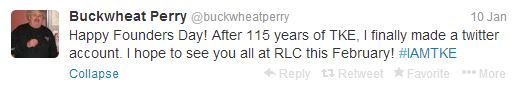 A Founders Day for the record books in terms of online engagement; Tau Kappa Epsilon fraternity swarmed the Facebook and Twitter world with the involvement of their members. Traditions and Founders Day rituals also provoked TKE nation to spread their fraternal memories and thoughts through social media. Even the legendary Buckwheat Perry joined in on the push by creating a Twitter Account for the occasion.