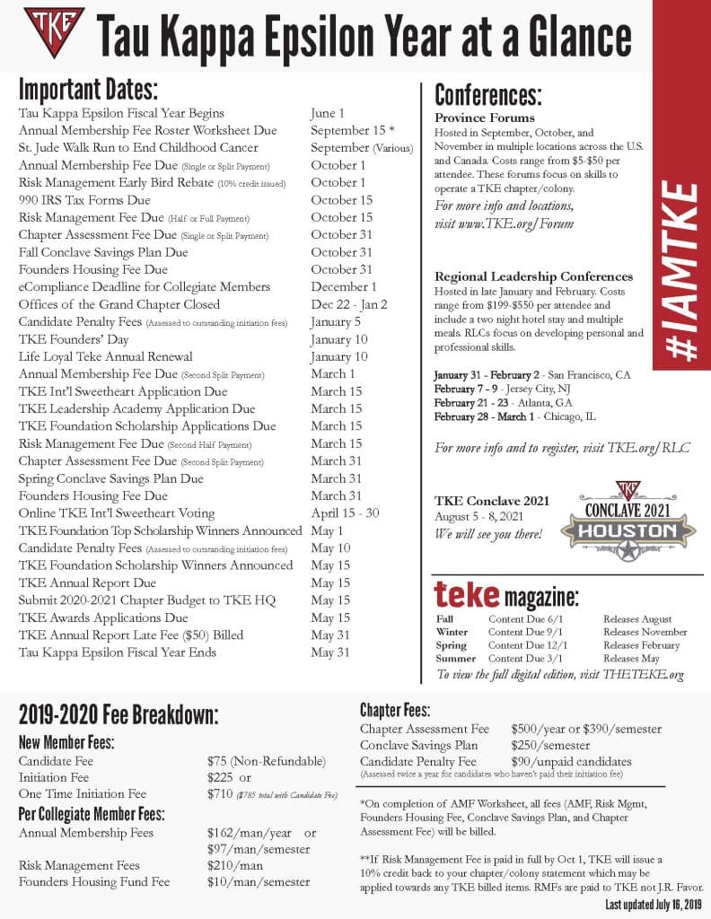 The 2019-2020 Tau Kappa Epsilon Year at a Glance outlines all due dates and necessary information for each chapter and colony.