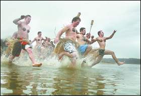 IOWA CITY, IOWA - Scott McGill stood on the wet beach, clad in swim trunks, a Dracula cape, Viking helmet and vest, and big, blue, funny glasses. "Are you ready to get in?" he shouted to more than 150 people,