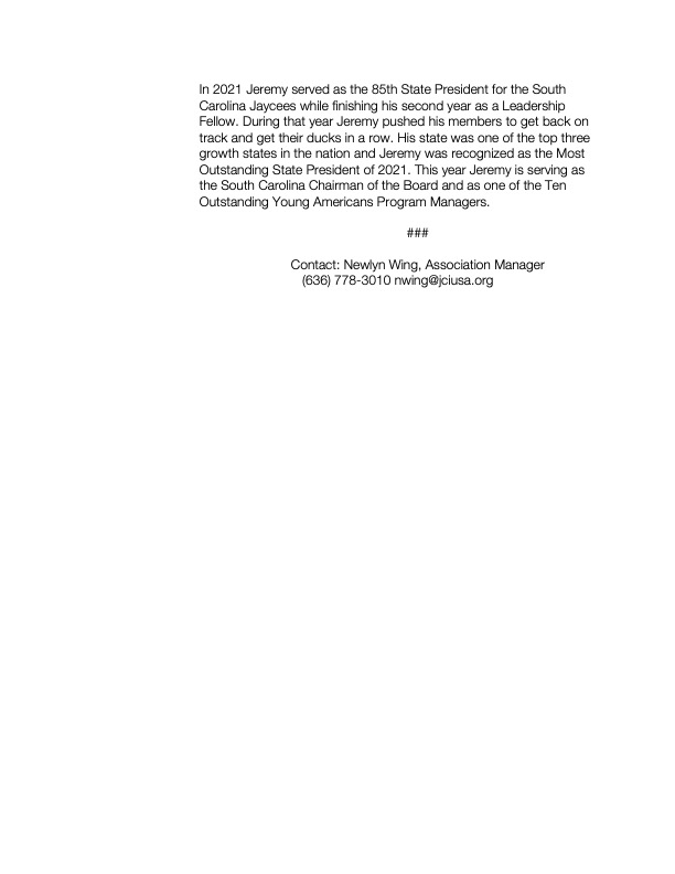 In 2021 Jeremy served as the 85th State President for the South Carolina Jaycees while finishing his second year as a Leadership Fellow. During that year Jeremy pushed his members to get back on track and get their ducks in a row. His state was one of the top three growth states in the nation and Jeremy was recognized as the Most Outstanding State President of 2021. This year Jeremy is serving as the South Carolina Chairman of the Board and as one of the Ten Outstanding Young Americans Program Managers.