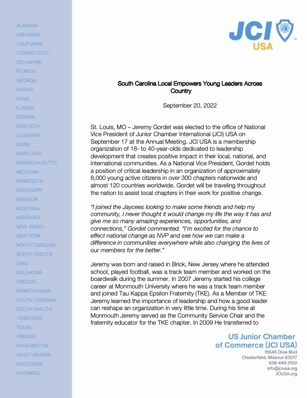 “I joined the Jaycees looking to make some friends and help my community, I never thought it would change my life the way it has and give me so many amazing experiences, opportunities, and connections,” Gordet commented. “I’m excited for the chance to effect national change as NVP and see how we can make a difference in communities everywhere while also changing the lives of our members for the better.”