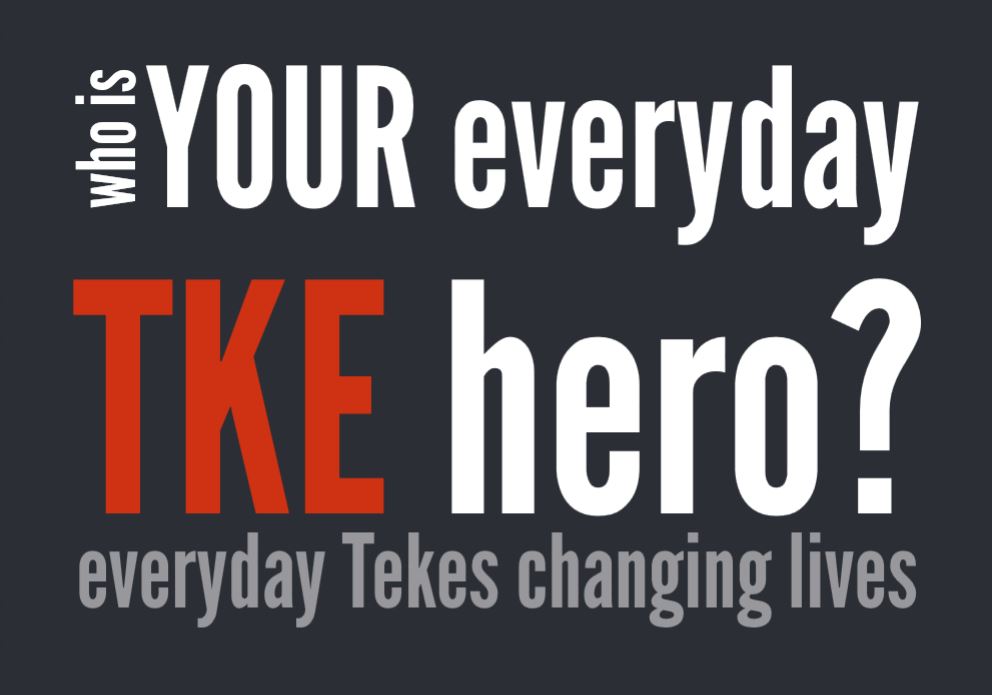 Everyday TKE heroes are around us; they are the men in the chapter that do community service with a smile on their face, they are the men in the classroom that sit in the front row, they are the alumni of your groups who still have their life dominated by love, charity, and esteem, and they are of course, a man of Tau Kappa Epsilon.