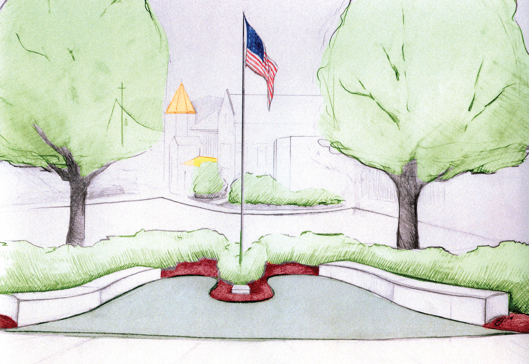 The memorial will be located across the street from Ss. Louis and Elizabeth Hall on the lawn of the J.C. Williams Center, overlooking the rain garden and the lower plaza area. Surrounded by cement benches, the central point of the memorial will be a flagpole and plaque.