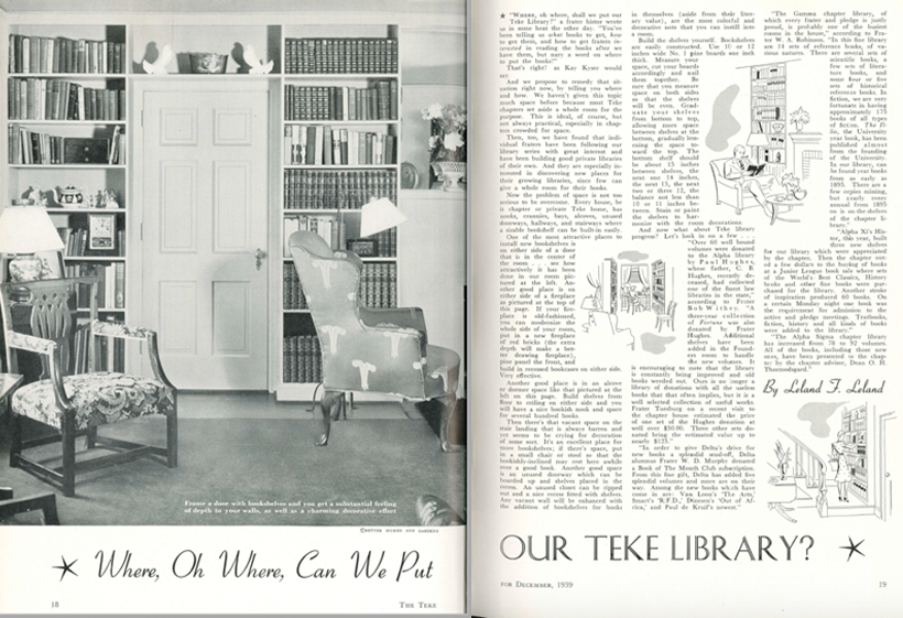 In December of 1939, THE TEKE began running ads and articles centered around the Teke Library. TKE has a long history with literature. Our Founders – Settles, McNutt, Mayer, Truitt and Atkinson – created the Knights of Classic Lore. A society whose avowed purpose was “to aid college men in mental, moral, and social development.” This organization would later become what we know today as TKE but literature remained a strong focus for these men. With this appreciation for literature deeply rooted in TKE history, it is no surprise that Teke Libraries are also a part of our culture as a Fraternity.