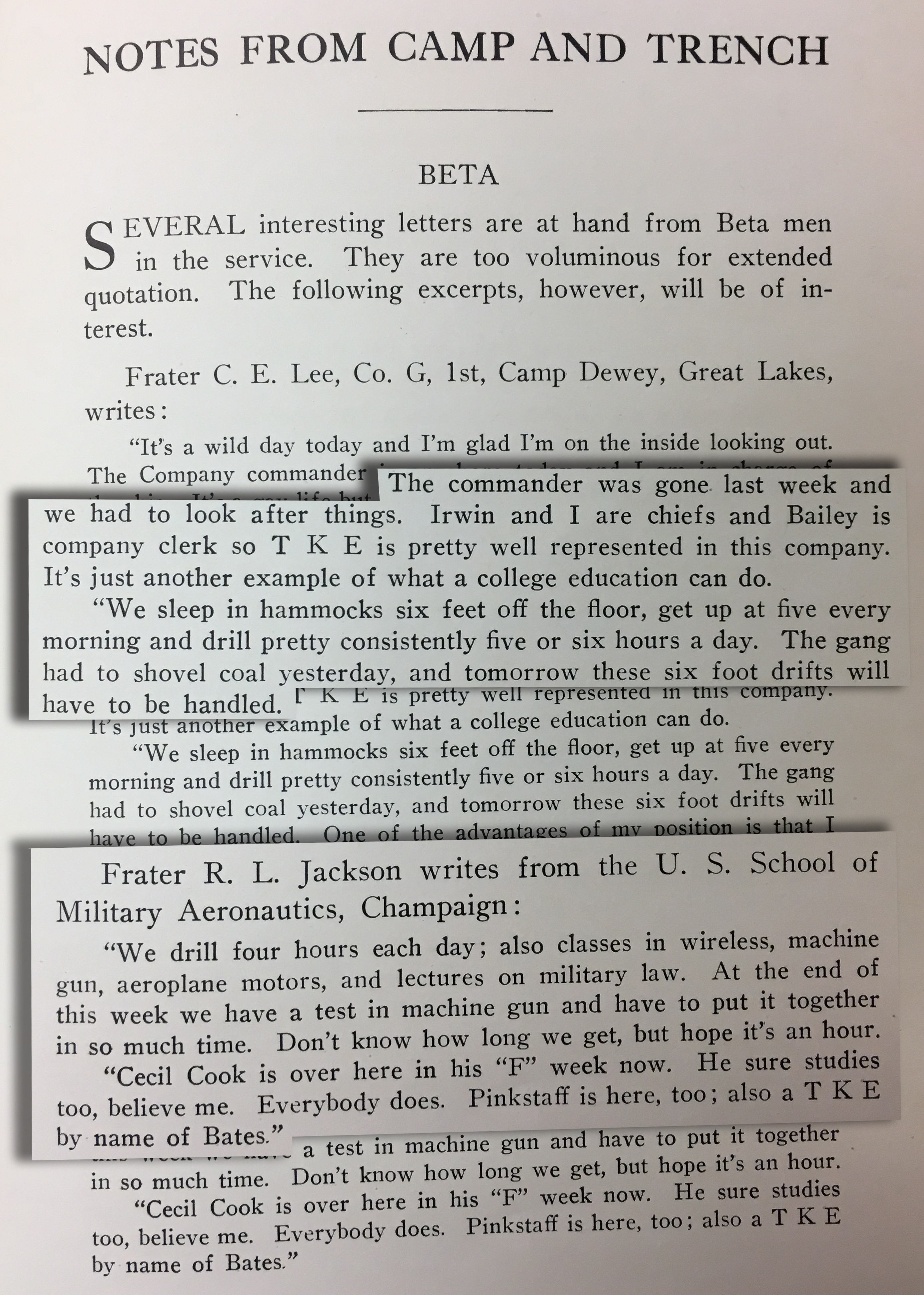 In a section entitled Notes From Camp and Trench, THE TEKE publishes excerpts of such letters.