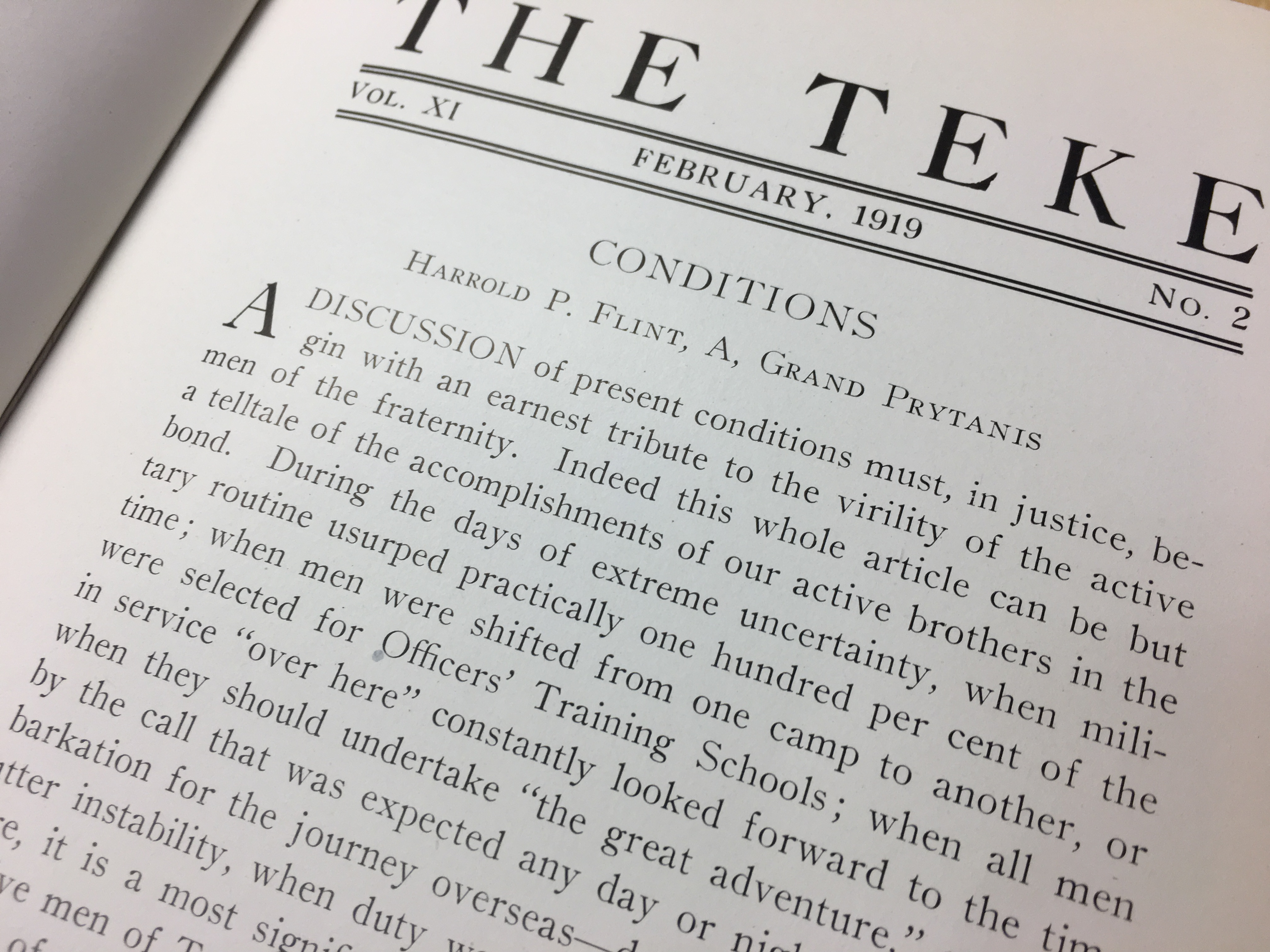 In recognition of this, we looked back through the archives of THE TEKE magazine, to a time when our great organization was a mere 20 years old. At the time the war broke out, TKE’s active chapters could be counted on fingers alone and THE TEKE regularly received and published letters from members. As we approach the 120th anniversary of TKE in 2019, it is good to be reminded of what an amazing organization these early Tekes created even amidst the trials and tribulations of two World Wars and a Depression.. We can only hope to do their hard work justice as we move into the next 120 years.