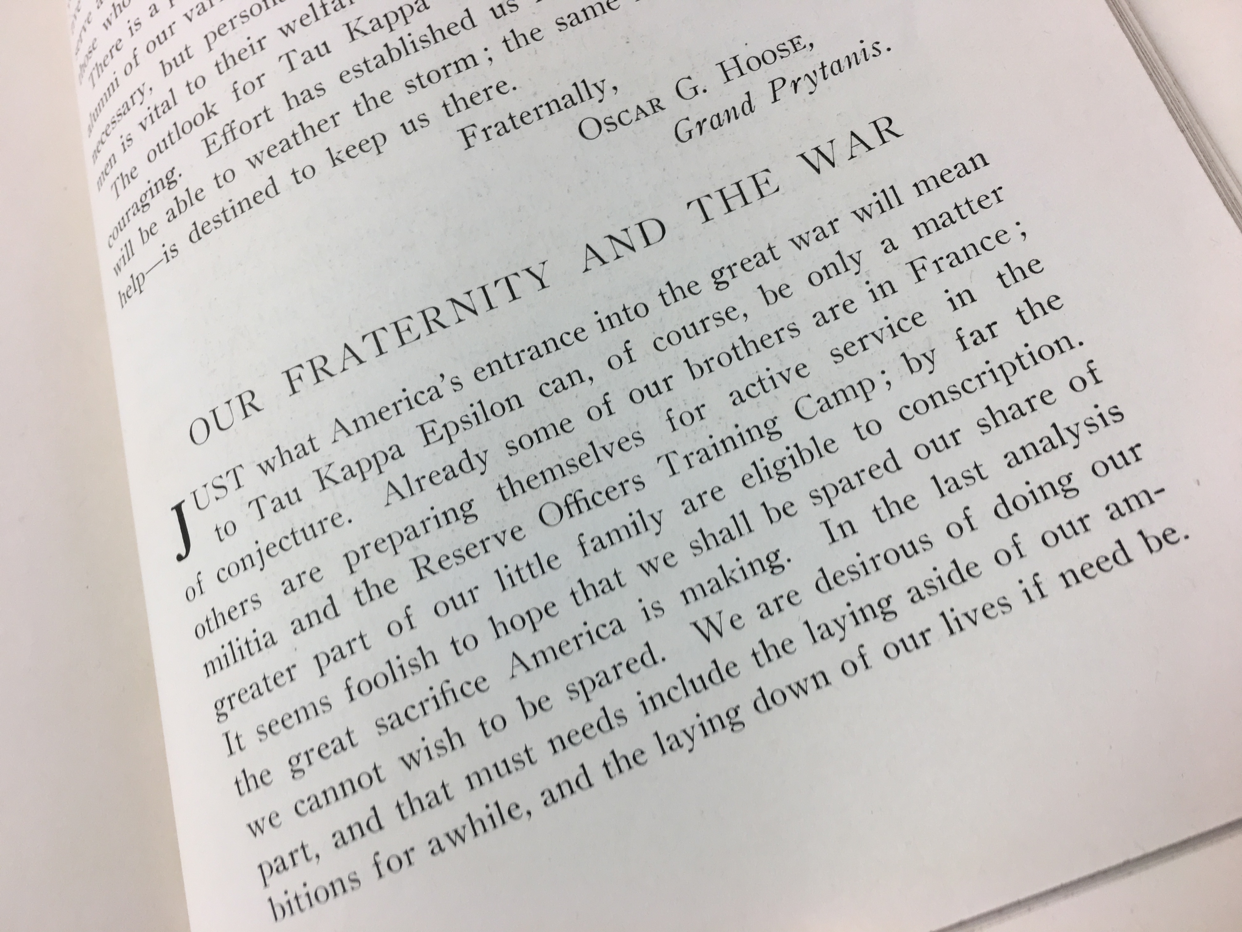 As it became clear that America would be entering the conflict, the pages of THE TEKE became filled with references to it. These early volumes of the magazine create an intimate look at what it meant to be a Fraternity man in those years. It is a view that is at once both familiar and foreign in their level of interconnectedness.