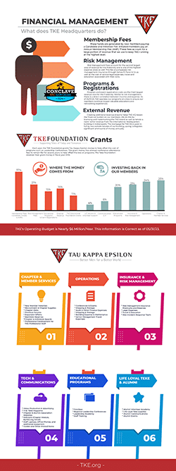 TKE is dedicated to building better men for a better world. We do that by providing our members with the tools and resources to grow and learn so that they can ultimately become the best version of themselves. This infographic is a great source of information on how our organization utilizes its funds, along with the funds generated from external sources, to provide the TKE experience that you know and love.