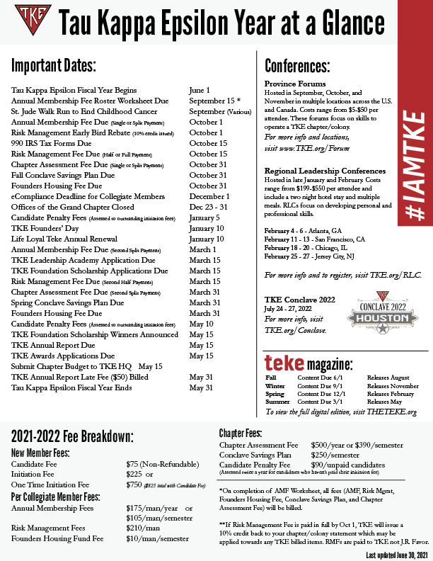 The 2021-2022 Tau Kappa Epsilon Year at a Glance outlines all due dates and necessary information for each chapter and colony.